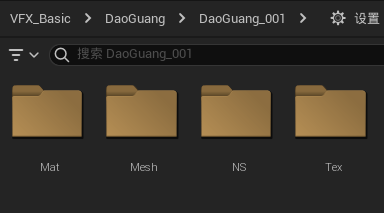 DaoGuang_001内根据需求创建独立的Mat(材质)NS(粒子系统)等文件夹。