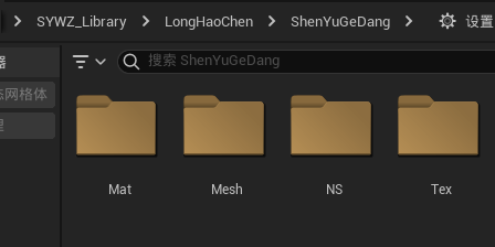 ShenYuGeDang内根据需求创建独立的Mat(材质)NS(粒子系统)等文件夹.